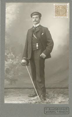 Esgrimista académico alemão num postal-caricatura de inícios do século XX. O desenho associa à imagem do duelista os signos de representação comuns aos estudantes de Heidelberga, Berlim, Paris e Coimbra (lunetas, cigarrilha), sem olvidar a remissão para elementos específicos da mitologia académica germanista (faixa peitoral, boné prussiano de pala, cicatrizes faciais).