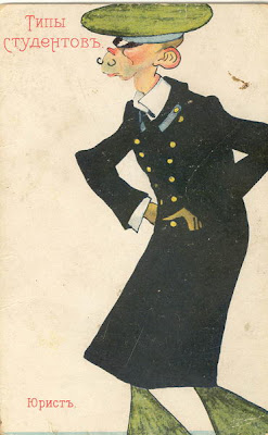 Conjunto de caricaturas alusivas a estudantes publicadas por volta de 1900 numa obra impressa em língua russa. Nas situações assinaladas destaca-se a indumentária militar à base de bonés/gorros regionais e casacões de botões metálicos.