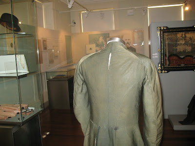 Ainda na parte da frente desta veste existe um bolso peitoral, talhado no lado esquerdo, ligeiramente oblíquo, pespontado, usado pelo detentor para exibição de lencinho branco e relógio de bolso. Da base do colarinho à bainha inferior atinge este exemplar 1,10m de altura, denunciando assim a baixa estatura do portador, numa época em que a “batina de lente” laico não poderia ser cortada acima da meia perna. As costas foram talhadas em quatro quartos, dois de cada lado da coluna vertebral, com 46 cms de altura (altimetria cintura/base do colarinho). Da linha da cintura para baixo coseram-se dois panos separados por racha central, ladeada por dois machos singelos, com 34,5cms de altura, estes encimados por botões forrados. São as chamadas costas de feitio de redingote, herdadas das casacas de finais de setecentos e das casacas de abas de grilo estilo império[10].