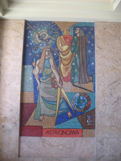 Confundida com a astrologia e a magia, a Astronomia é um saber com representação alegórica e atributos desde a Grécia Clássica, onde por vezes aparece confundida com Urania. No desenho curricular das universidades medievais, a Astronomia integrava o Quadrivium. Na passagem da Época Moderna para a Época Contemporânea, e ilustrando o triunfo do método cartesiano e da revolução científica, a Astromia foi deslocada do plano de estudos de Artes Liberais para as Faculdades de Ciências emergentes. No caso vertente, António Lino empresta à lição atributos alheios, colhidos na Geometria e na Arquitectura (compasso), em Cronos (clepsidra), e na reverie dos descobrimentos portugueses (astrolábio). Em todo o caso, o céu estrelado está lá, atravessado pela balestilha, como que a lembrar o céu pintado em naves de igrejas de antanho (Lino tinha estudado em Itália e conhecia bem os frescos e mosaicos das igrejas) e o famoso "el cielo" da Universidade de Salamanca (belíssima cúpula celeste onde não faltam as figuras do zodíaco).