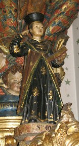Entretanto, descobri que existe uma imagem do mesmo santo em Meixomil-Paços de Ferreira, onde está também representado como Doutor, com loba e barrete redondo de picos (sem borla, parece-me). Penso que aqui, tal como na imagem do Colégio da Esperança, a figuração da loba é bastante rigorosa (especialmente no detalhe da carcela da sotaina). Contudo, o capelo (de dupla murça) não apresenta alamares nem carcela, assim como cor científica (não sei se por ignorância do "santeiro" se por intenção, de modo a não o veicular a nenhuma especialidade científica). Uma vez que não sou entendido em História de Arte, não me arrisco a dar cronologia para a elaboração destas imagens.
